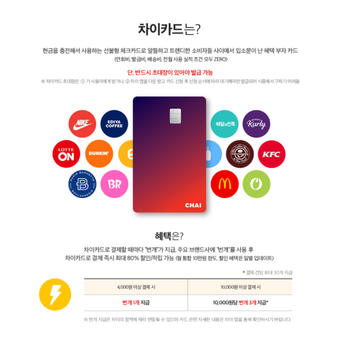 국내 핀테크 기업 차이코퍼레이션과 비씨카드가 만든 이 차이카드의 번개드로우 혜택은, 결제 시 얻을 수 있는 포인트인 번개를 걸고 응모한 고객에게 추첨을 통해 경품을 지급하는 행사 입니다.