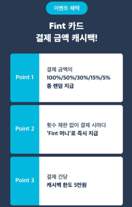 디셈버앤컴퍼니 자산운용이 비씨카드와 선보인 핀트카드는 다음달까지 결제 금액의 최대 100%를 핀트머니로 되돌려주는 행사를 진행합니다. 결제 건당 캐시백 한도는 5만원이며 결제 금액의 최소 5%부터 최대 100% 까지 적용된다고 합니다.