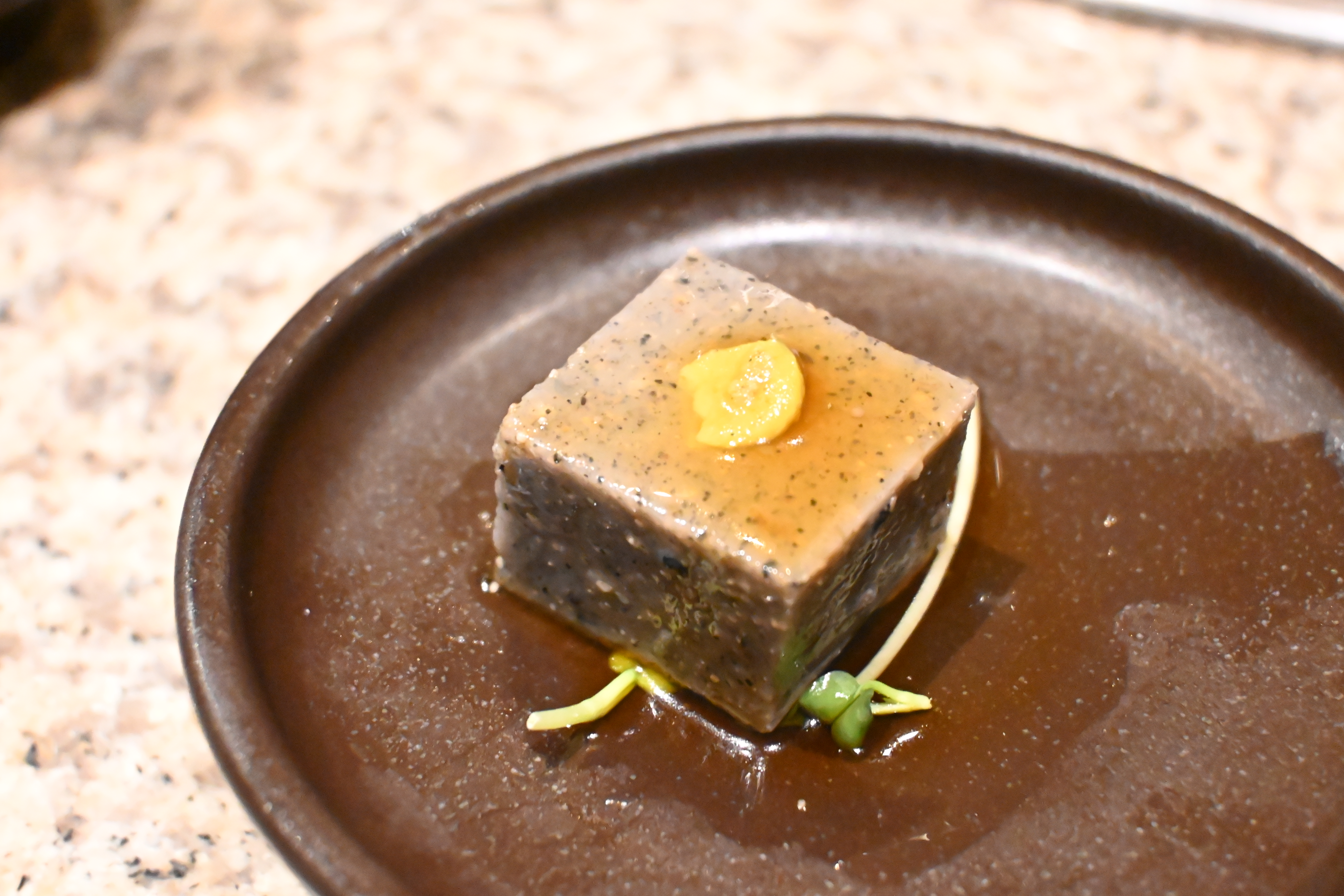 전채요리 입니다. 흑임자로 만든 두부에 겨자, 간장소스가 올려져 있습니다. 이거 정말 별미더라구요. 흑임자 크게 선호하지 않는 편인데 참 맛있습니다. 마치 치즈 같기도 해요. 그리고 작은 샐러드. 오리엔탈 소스가 올려져 있는데 정말 상큼하고 전식으로 아주 훌륭했어요. 맛있게 싹싹 비웠답니다.