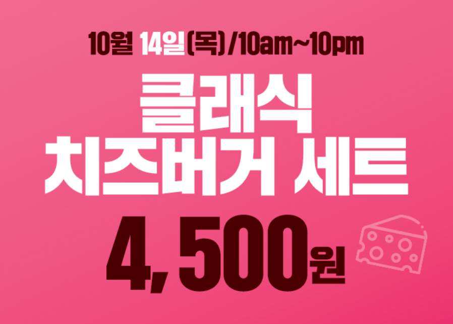 10월 14일 목요일 10am~10pm 클래식 치즈버거 세트 4,500원