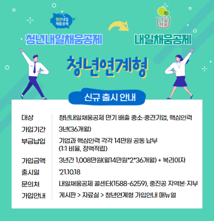 이번에 새롭게 출시된 청년 연계형 내일채움공제를 이용하면 기존에 청년내일채움공제에 가입했더라도 만기 이후 일반 내일채움공제에 다시 가입 가능합니다. 청년 재직자들이 중소기업에서 계속해서 일할 수 있도록 추가 지원하기 위한 취지 입니다. 청년 내일채움공제 만기자는 현재 12만명 정도인데요, 이번 청년 연계형 내일채움공제 상품은 부담 완화를 위해 가입기간을 5년에서 3년으로 줄였고 월 납입금액도 평균 24만원에서 14만원으로 낮췄습니다. 만기에는 1008만원을 받게 되는거죠.