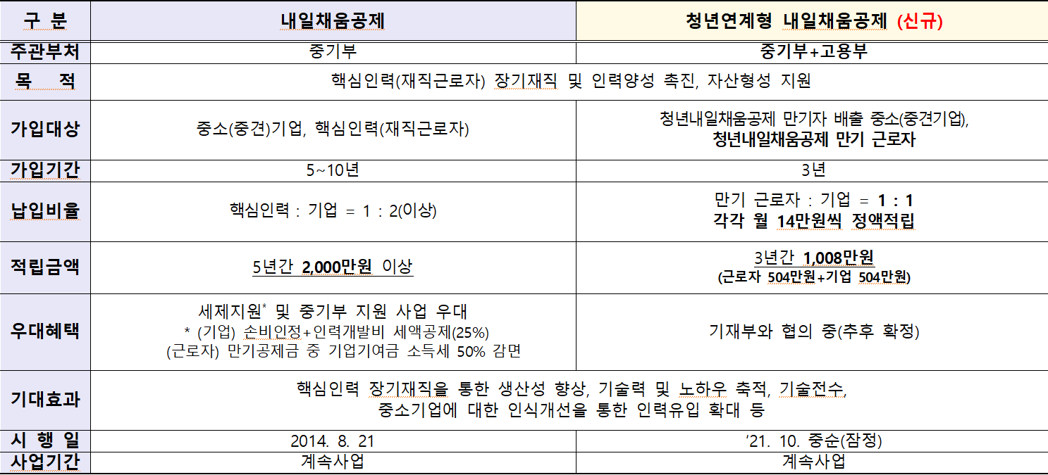 기존 내일채움공제와 신규 청년연계형 내일채움공제 비교표