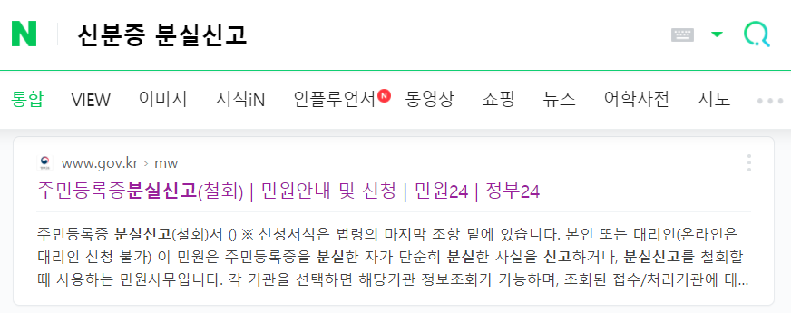 포털사이트에 신분증 분실신고를 검색하시면 정부24 신분증 분실신고 란으로 바로 넘어갑니다.