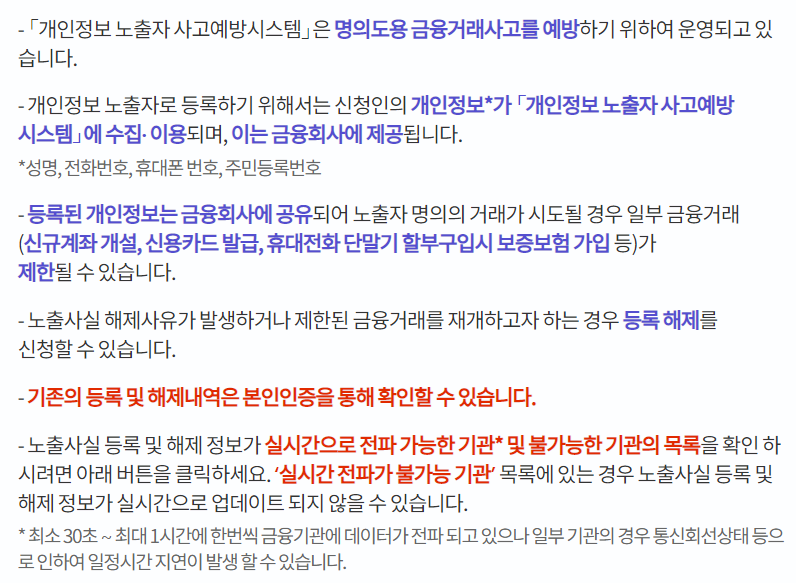 여기서 위사진 노란형광펜으로 표기된 개인정보 노출 등록을 해주시면 명의도용 금융거래사고를 예방하실 수 있습니다.