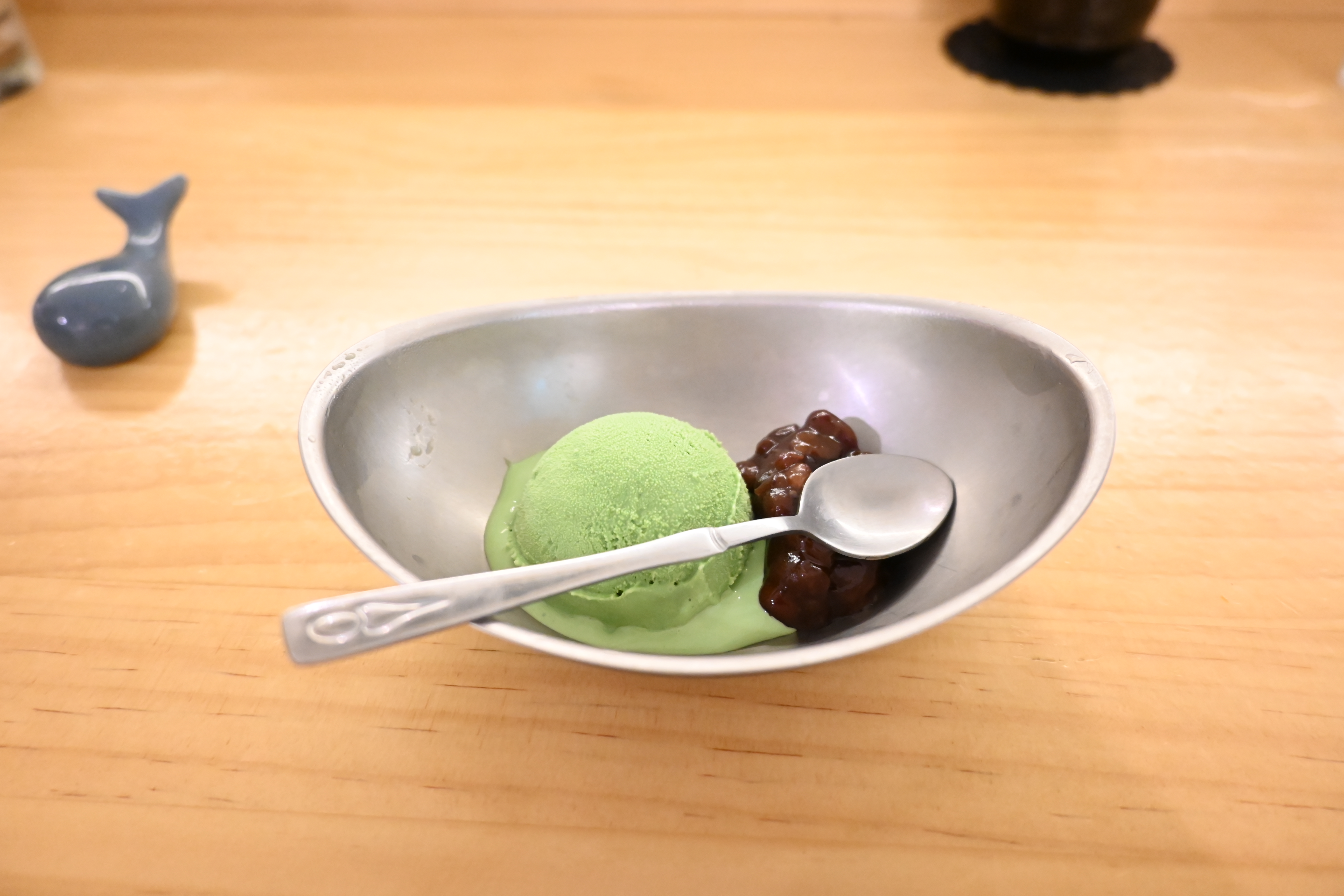 후식 교꾸와 팥조림을 곁들인 말차 아이스크림 입니다. 5만5천원에 잘 먹은 느낌이었어요. 신사동에서 미들급 스시야 찾으시는 분들은 방문해보시길 추천합니다. 특히 맛있는 고등어를 드시고 싶다면 강추 합니다.