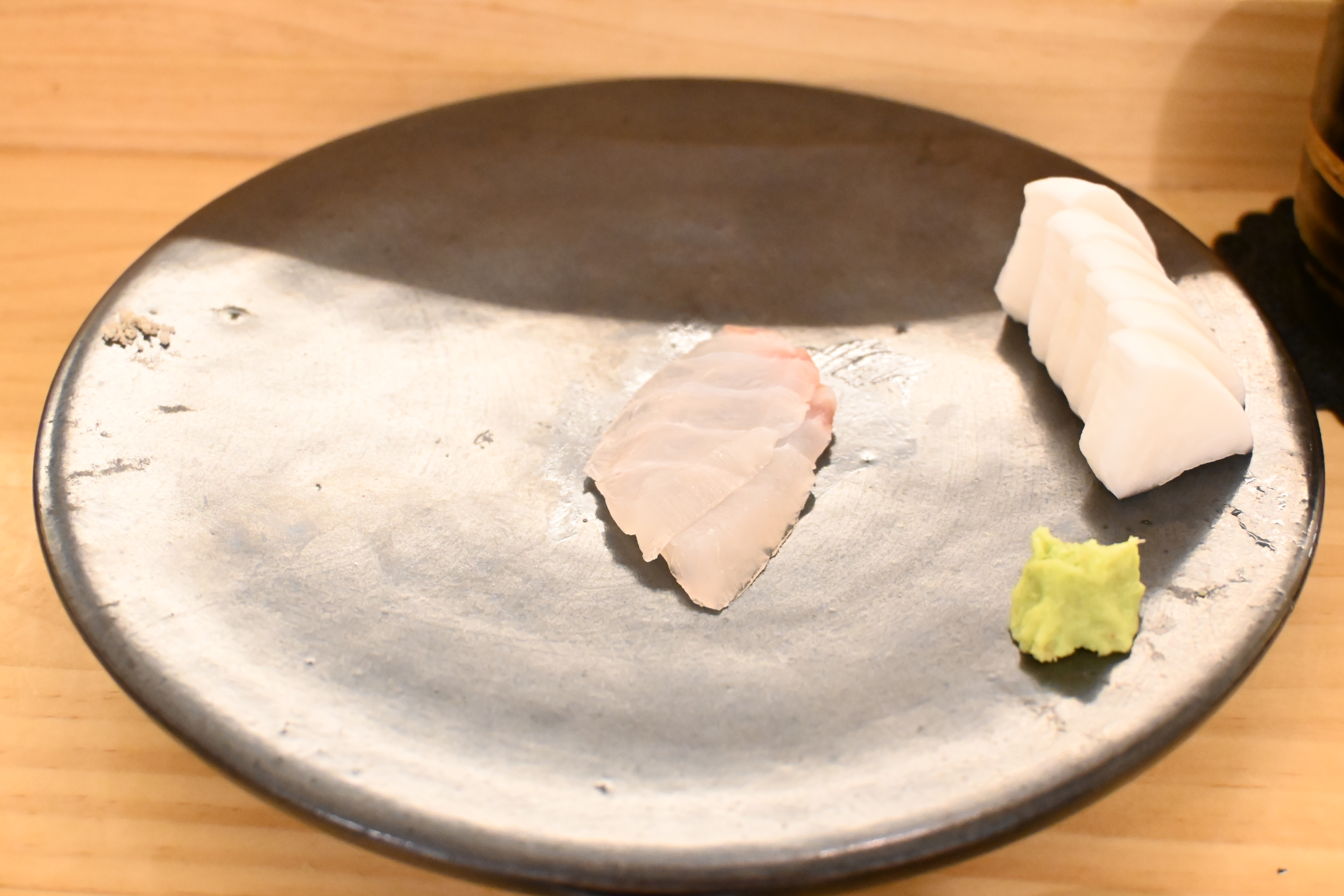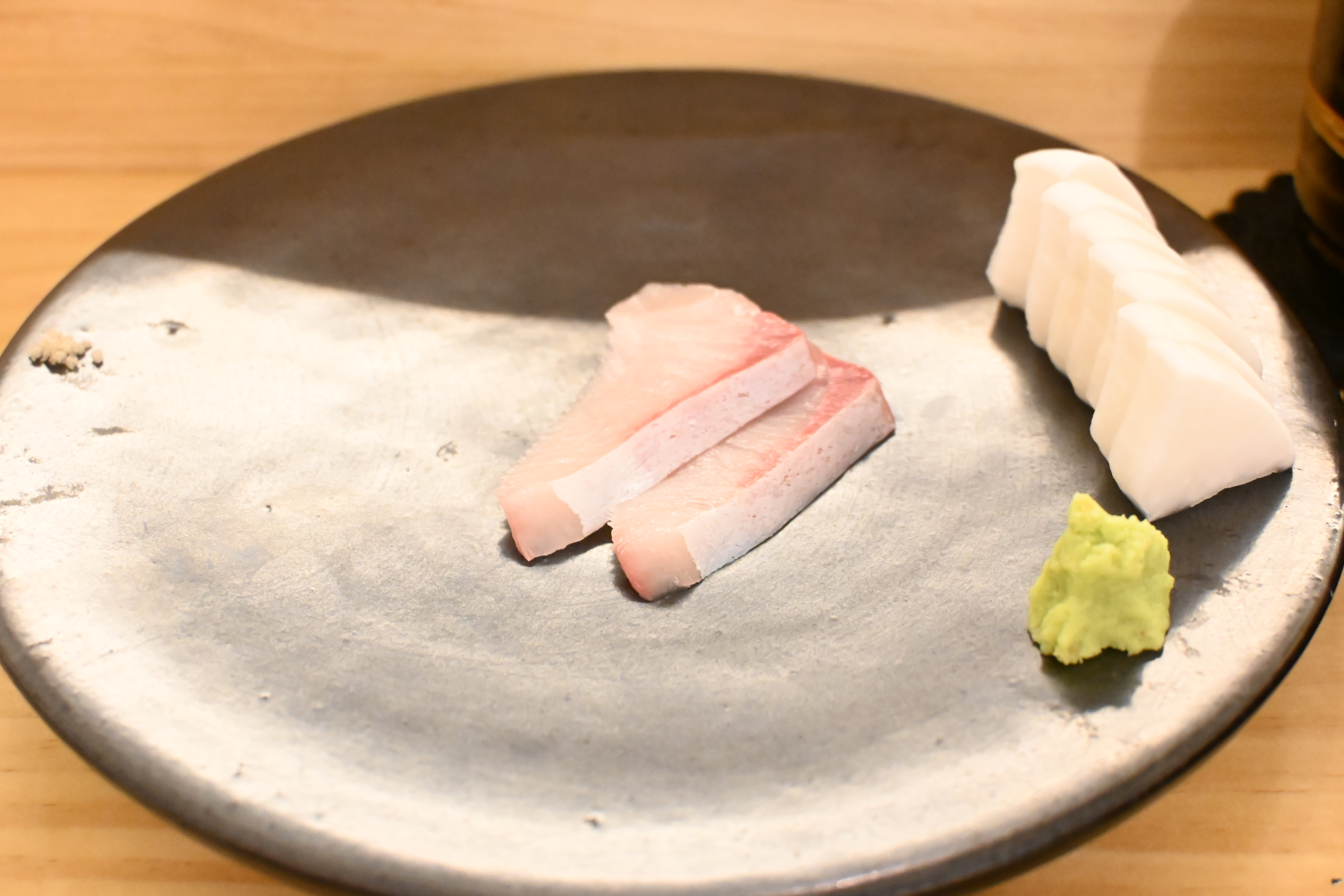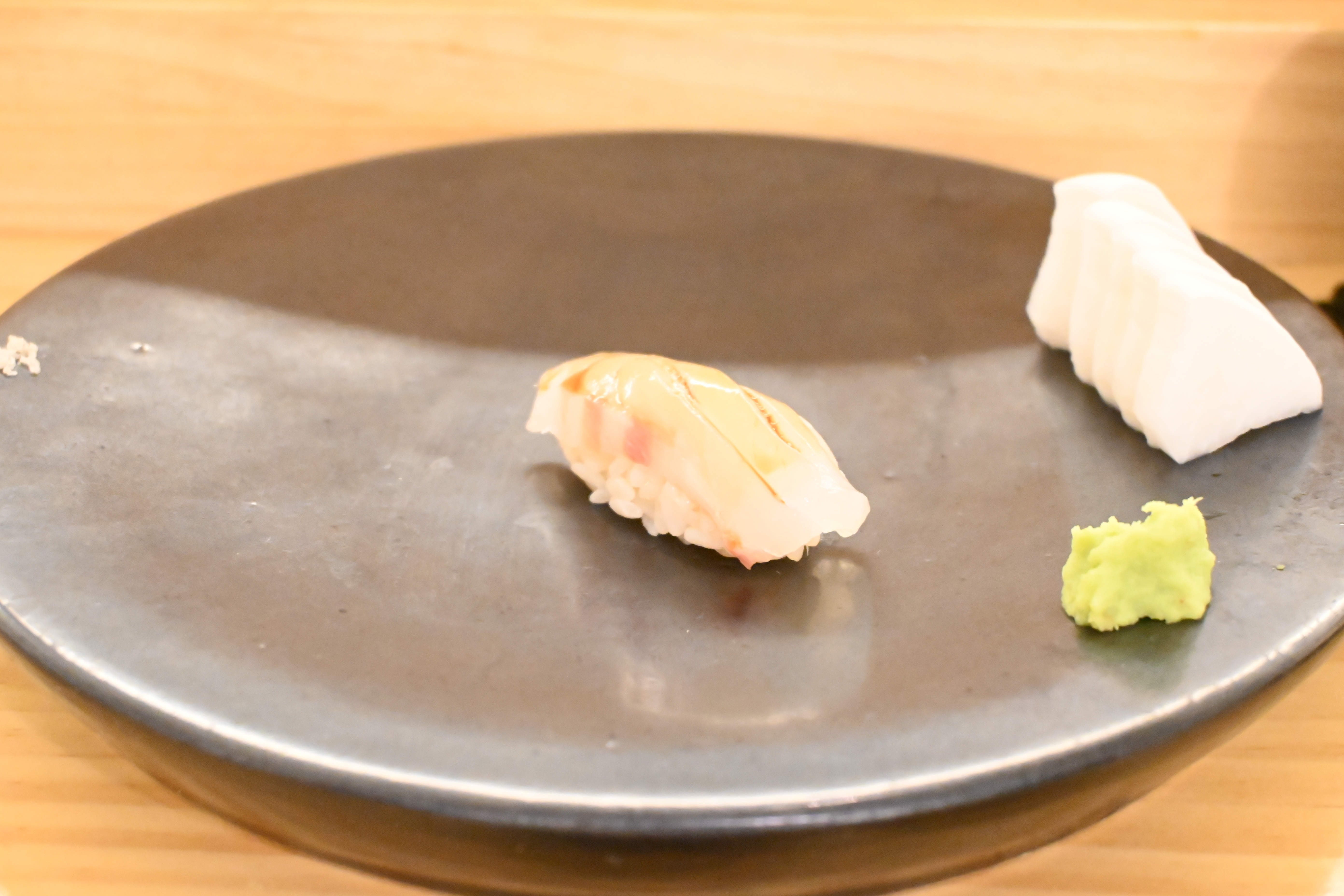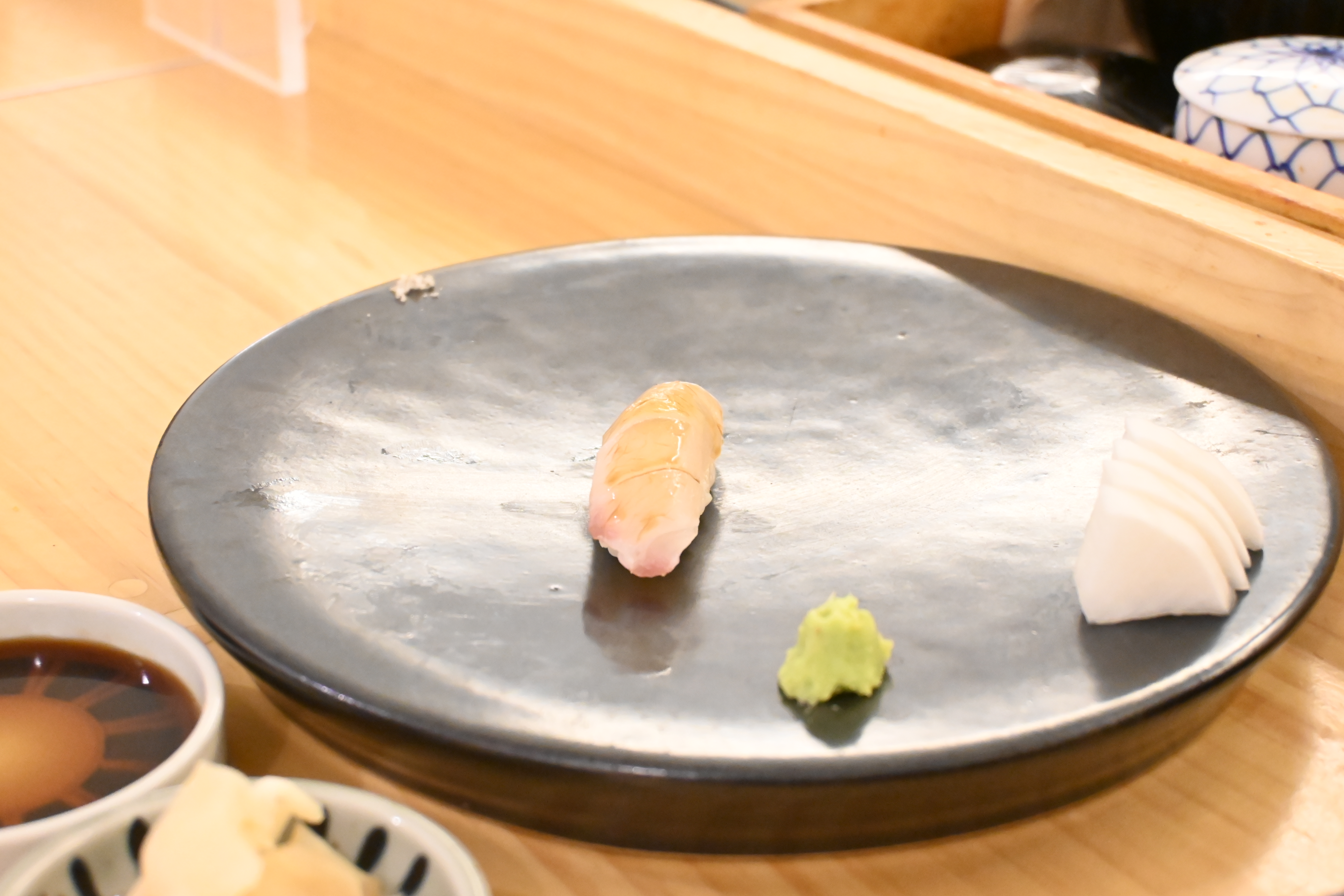 첫번째 스시는 능성어입니다. 사시미로 이미 맛봤지만 스시로도 훌륭합니다. 샤리도 정말 맛있었어요.