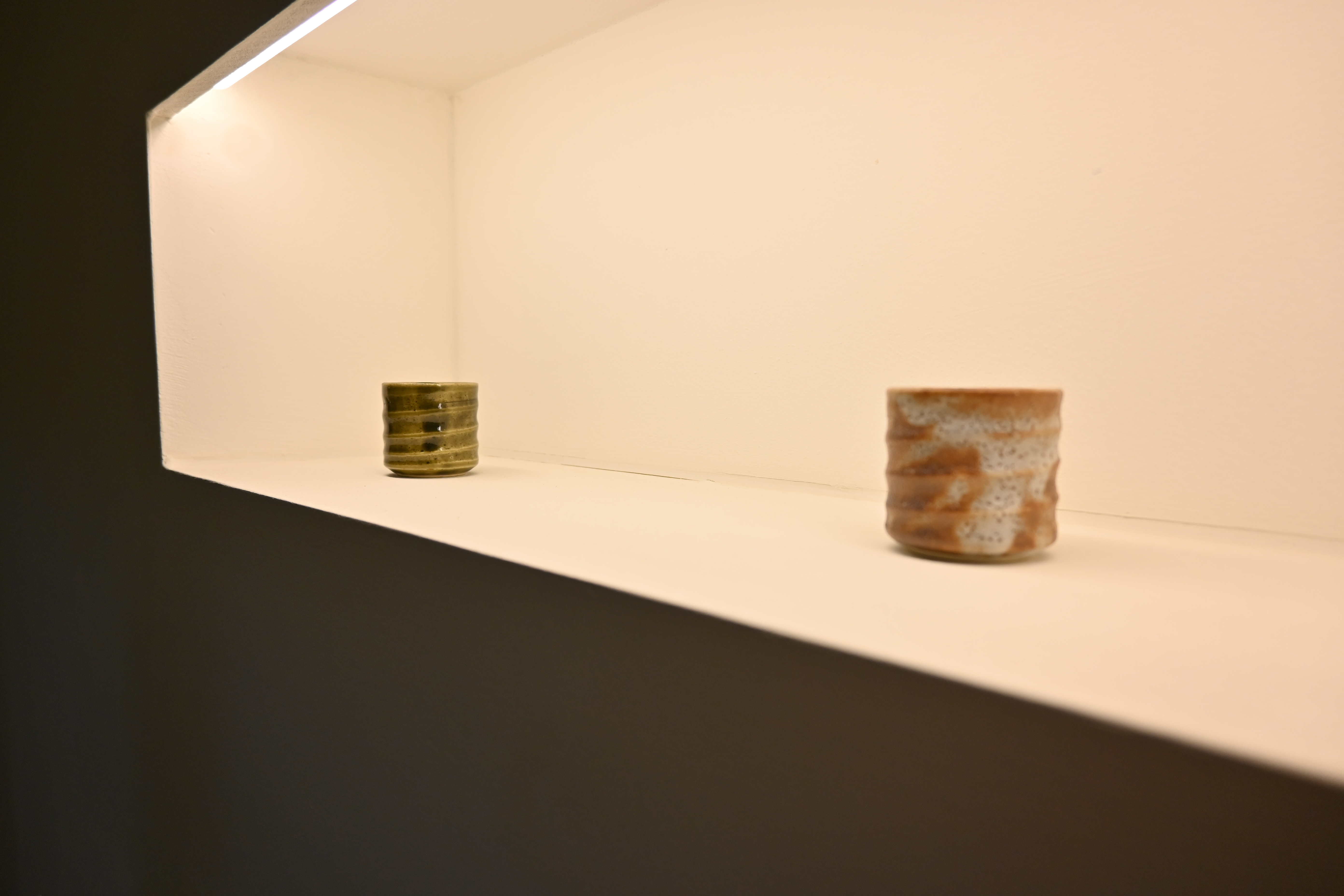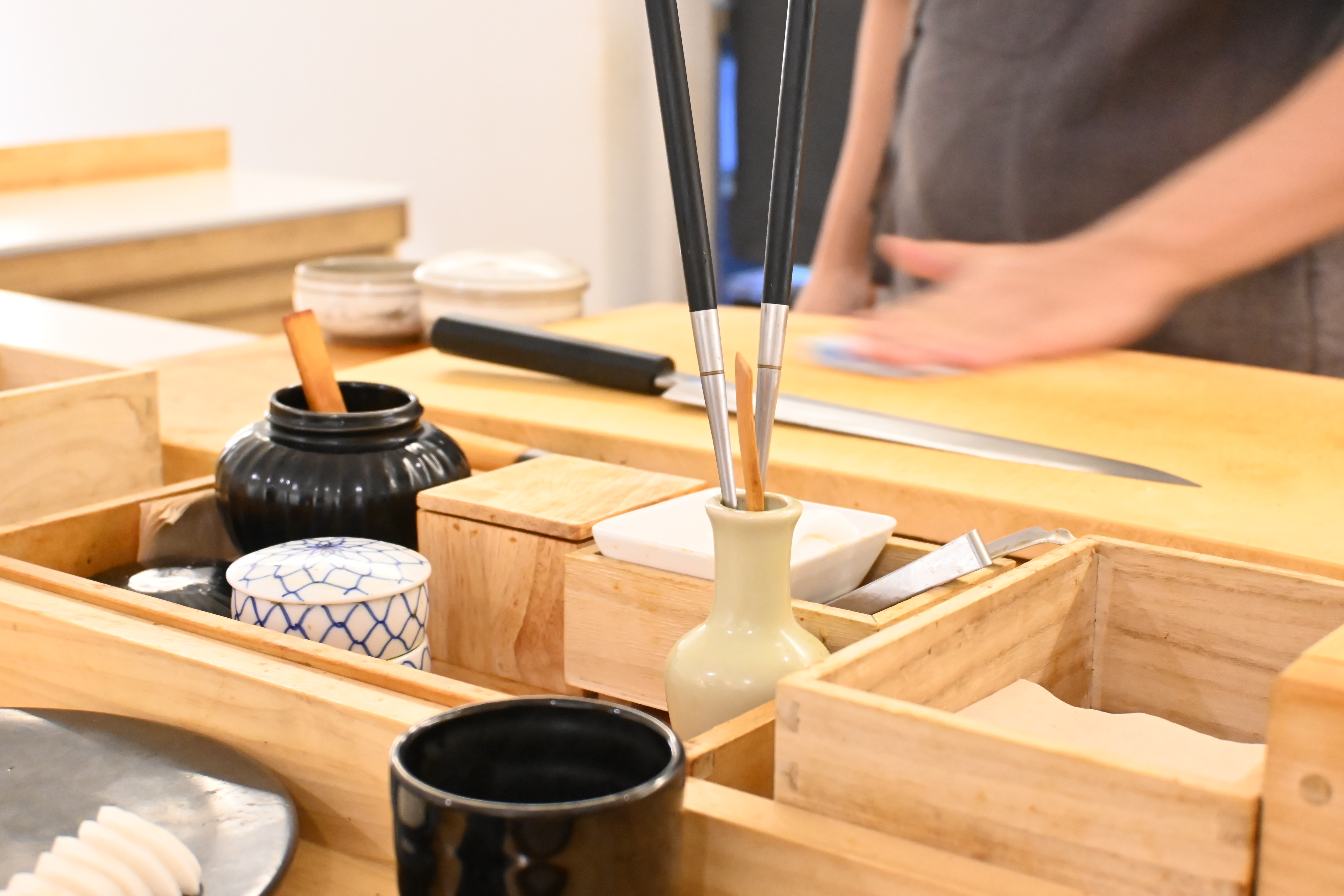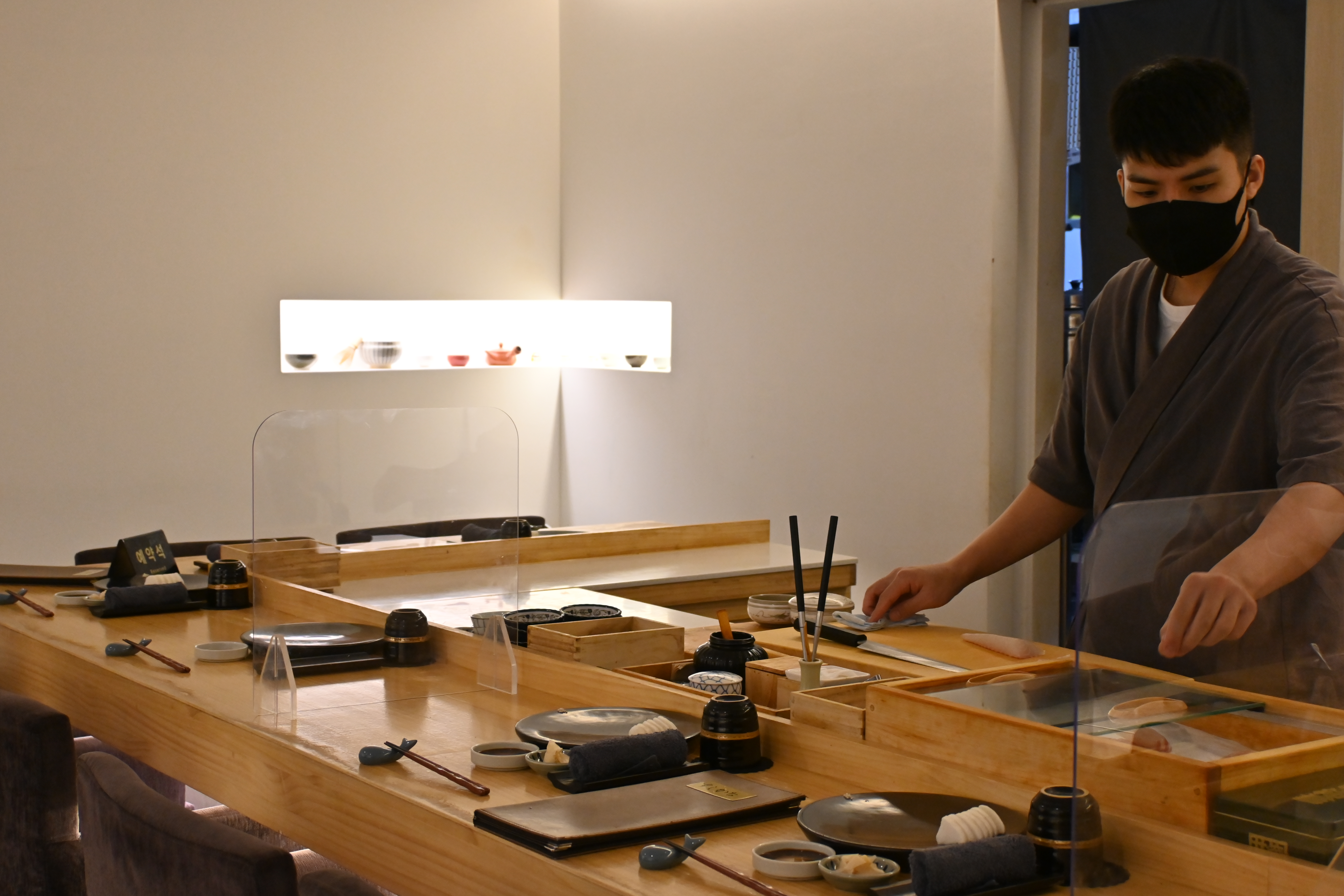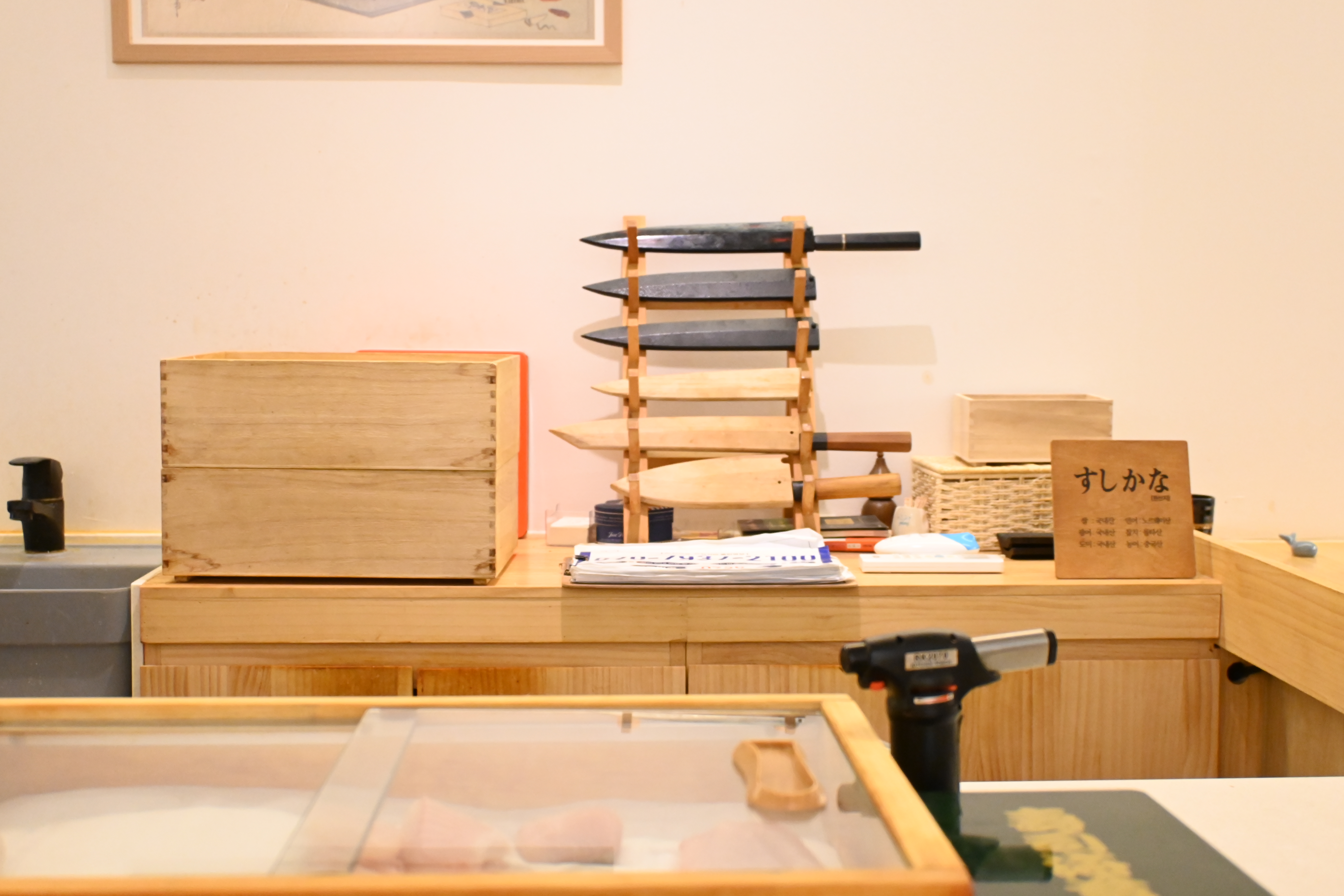 스시카나는 지하에 위치하고 있습니다. 입구에 들어가보면 정갈하게 식기와 분재가 진열되어 있어요. 사진상에는 없지만 세면대도 있어서 손을 미리 씻고 들어갈 수 있어 편했습니다.