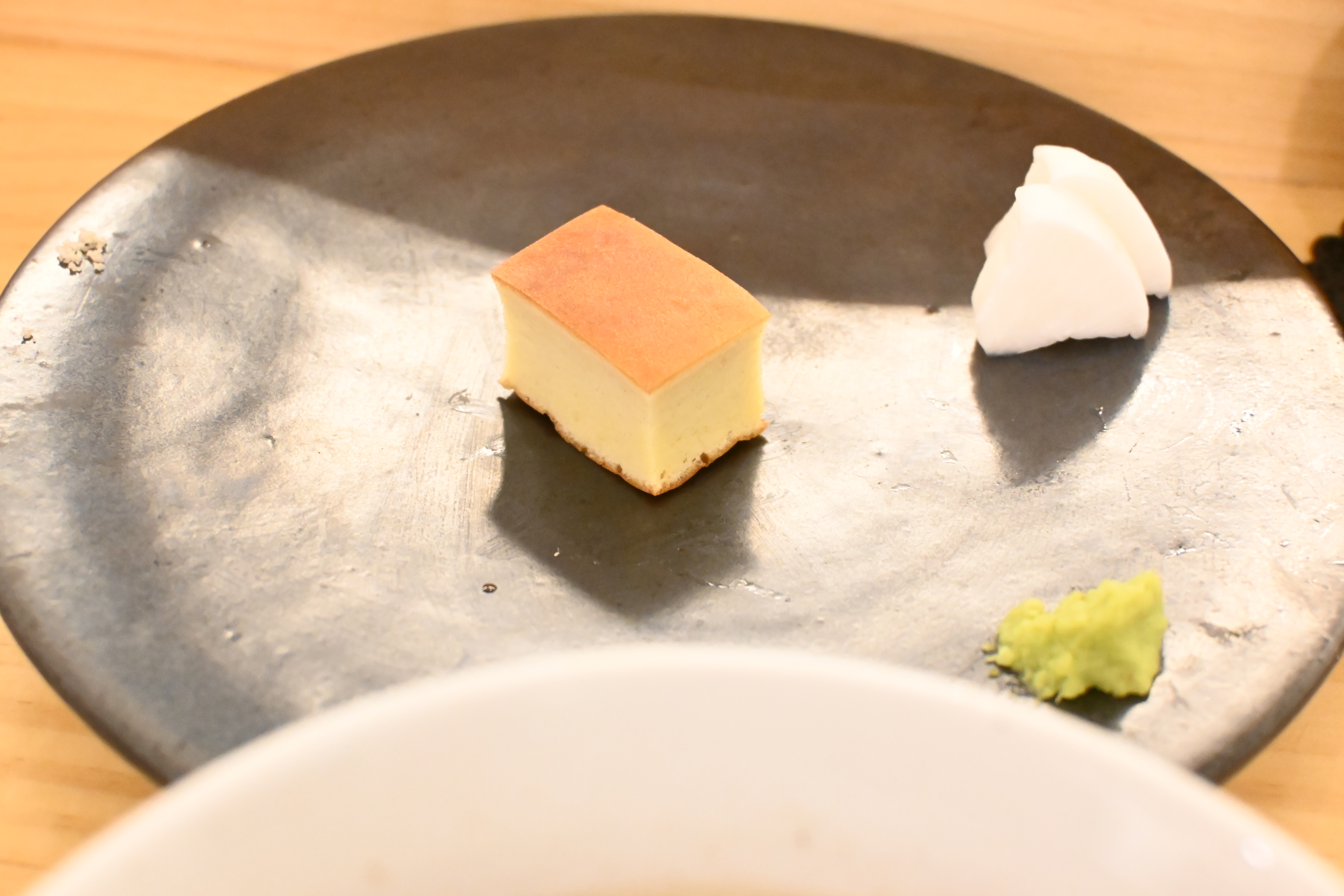 첫번째 메뉴입니다. 표고버섯으로 만든 일본식 스프인데요. 버섯향이 많이 나고 식감은 조금 거칠었습니다. 유일하게 식사 중 불호.. 차라리 차완무시가 나왔으면 좋았겠다 싶었지만 버섯 좋아하시는 분들은 맛있게 드실거같습니다. 같이간 지인도 스프는 불호라고 하더라구요.