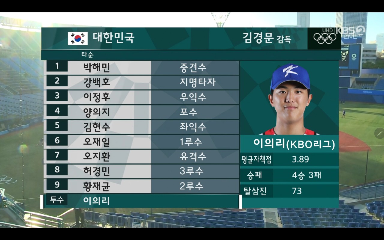 어제 안타깝게 올림픽 야구 대한민국 팀 미국에 패배했지만 오늘 도미니카 공화국과의 경기에서는 좋은 결과를 가져 왔으면 좋겠습니다. 오늘 야구팀에는 이의리 선수가 투수로 나섰는데요