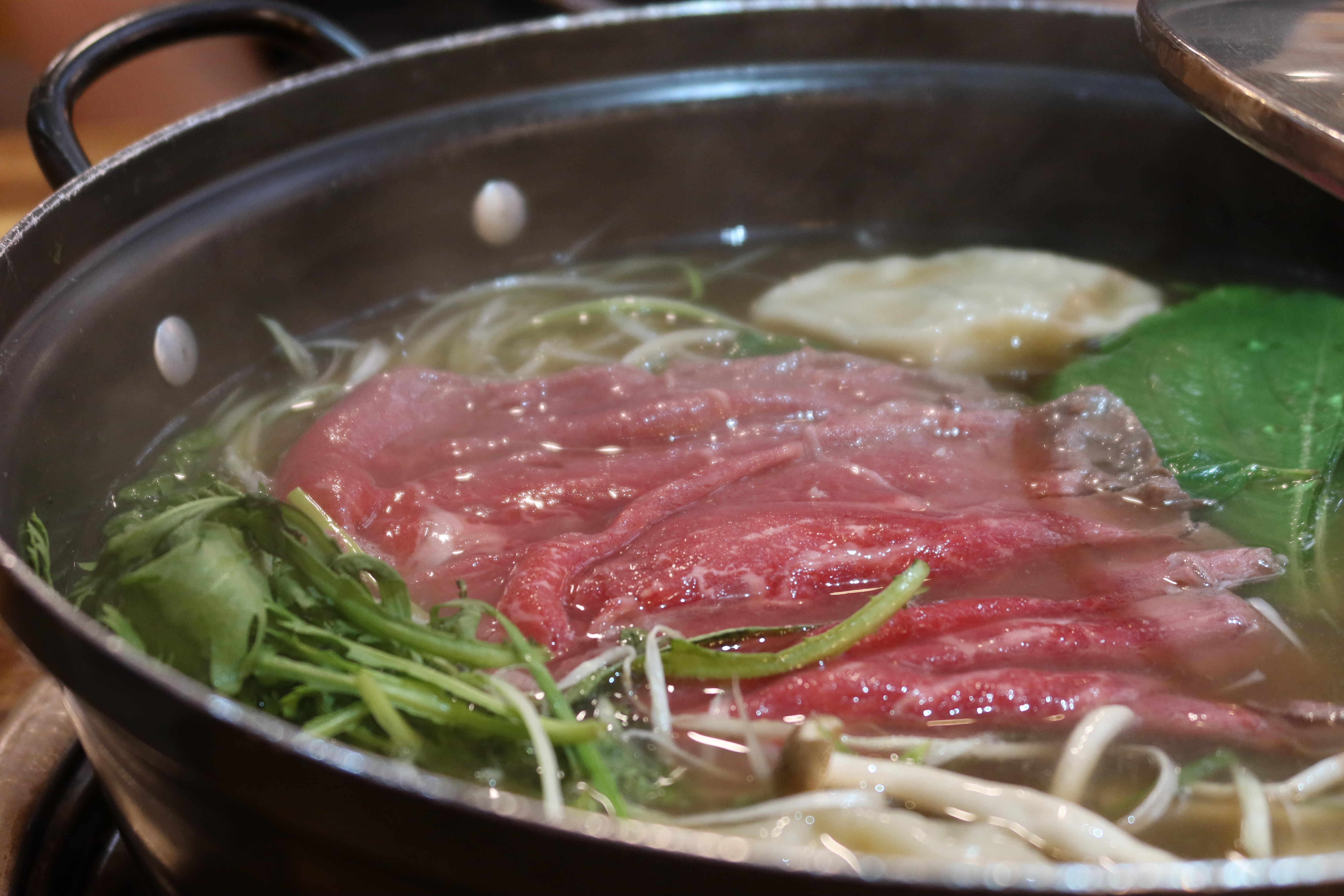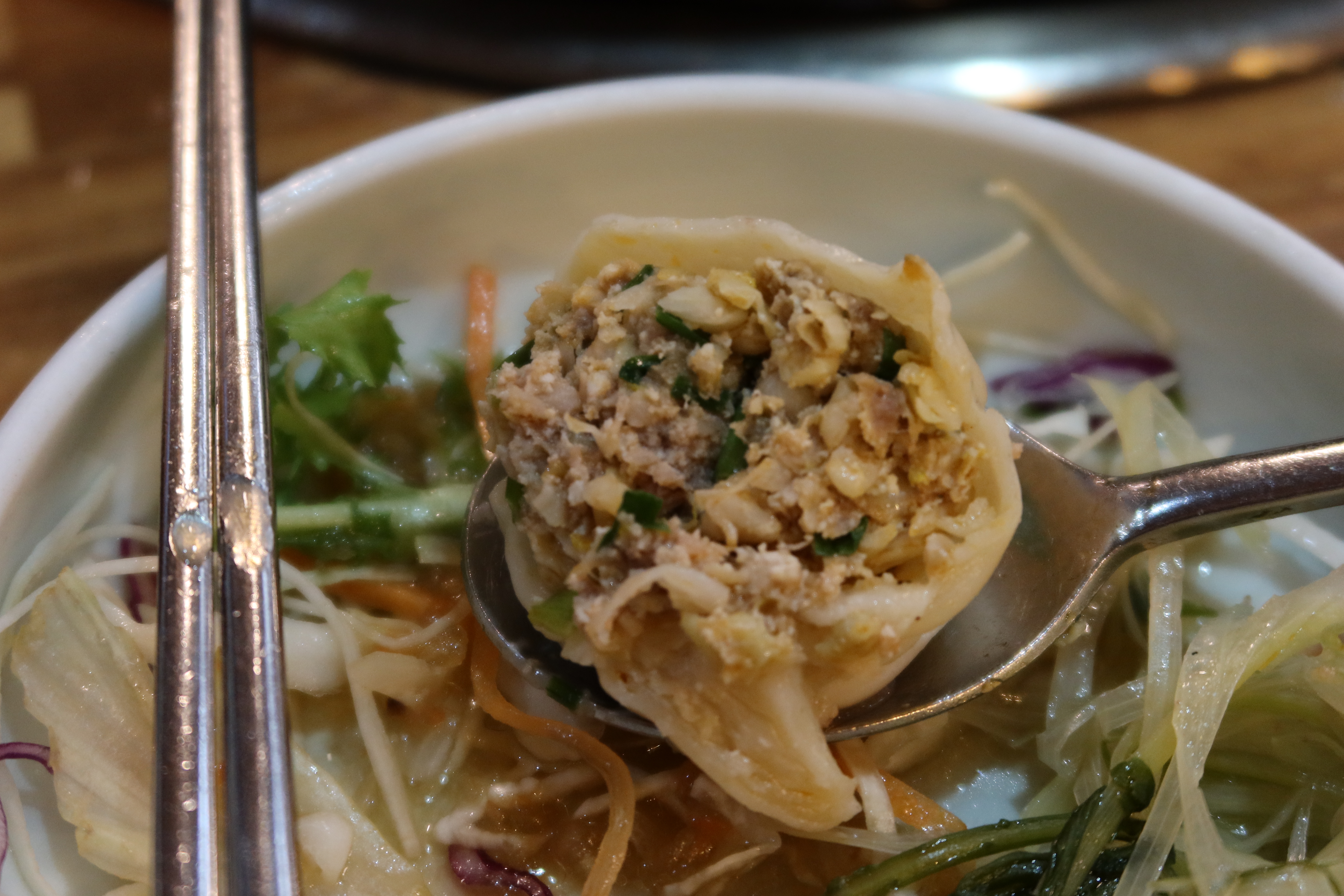 만두와 면 투하! 익는데 시간이 좀 걸려서 가장 먼저 넣어요. 여긴 신기한게 만두피가 두꺼운 편인데 그 피가 맛있어서 안남기고 다 먹게 되요. 만두개수는 1인분에 2개인데, 2개만 먹어도 이미 배 엄청 불러요. 그만큼 큽니다.