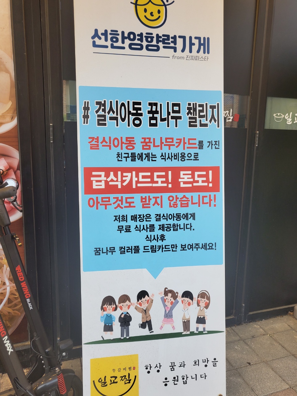 가게 앞에 주차 할 수 있는 구역들이 있구요, 들어가기전 깜짝 놀랄만큼 대단한 입간판을 보게 되었는데요, 결식아동 꿈나무 챌린지라고, 결식아동 꿈나무카드를 가진 친구들에게는 식사비용으로 급식카드도, 돈도 아무것도 받지 않고 꿈나무 컬러풀 드림카드만 보여드리면 식사 후 무료식사를 제공한다는 내용이었어요. 사실 식사 전에 보여주는 거면 좀 눈치 보일 수 있을텐데 식사 후에 그냥 보여주면 된다는 점도 꽤 신선한 아이디어라고 생각이 들었답니다.