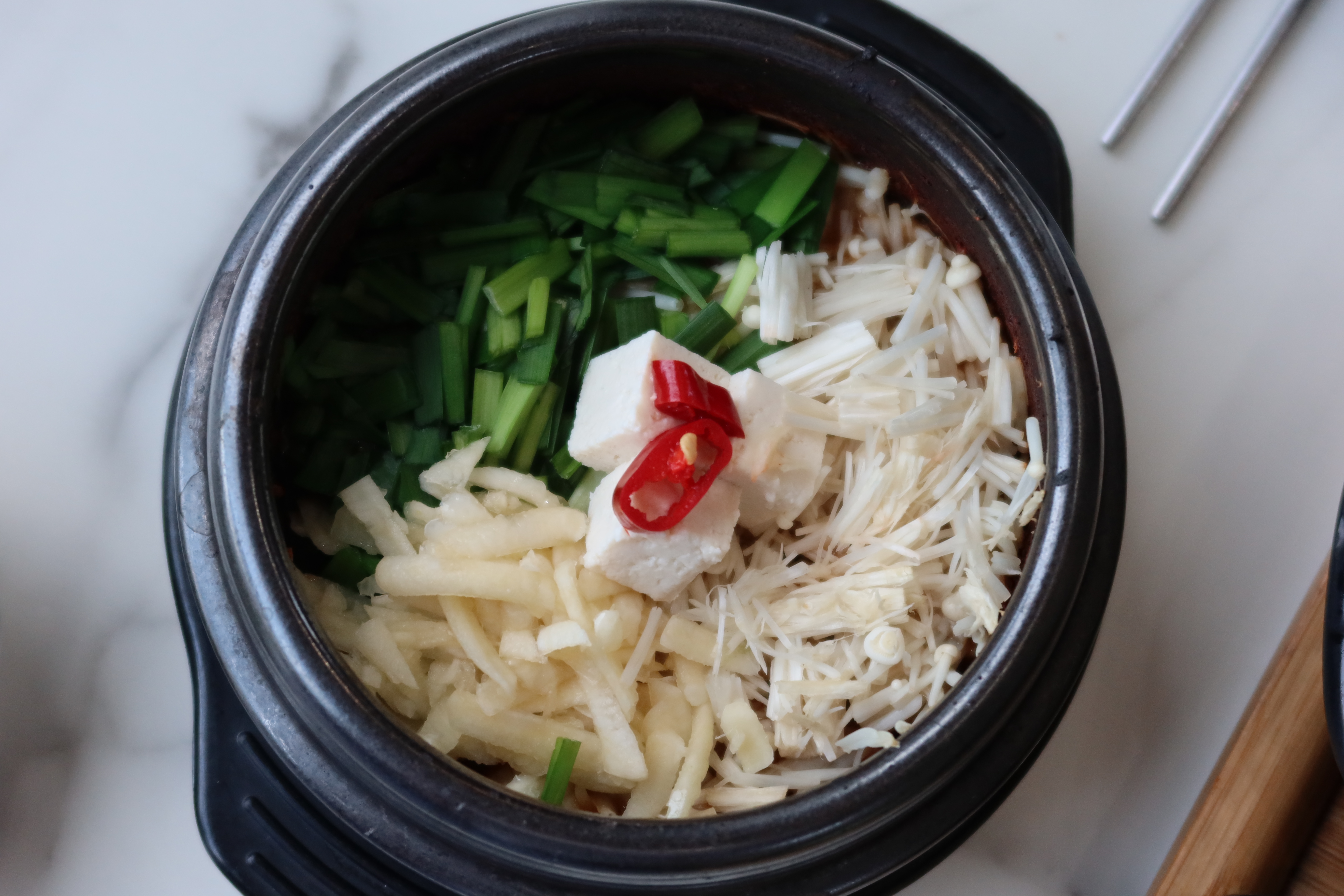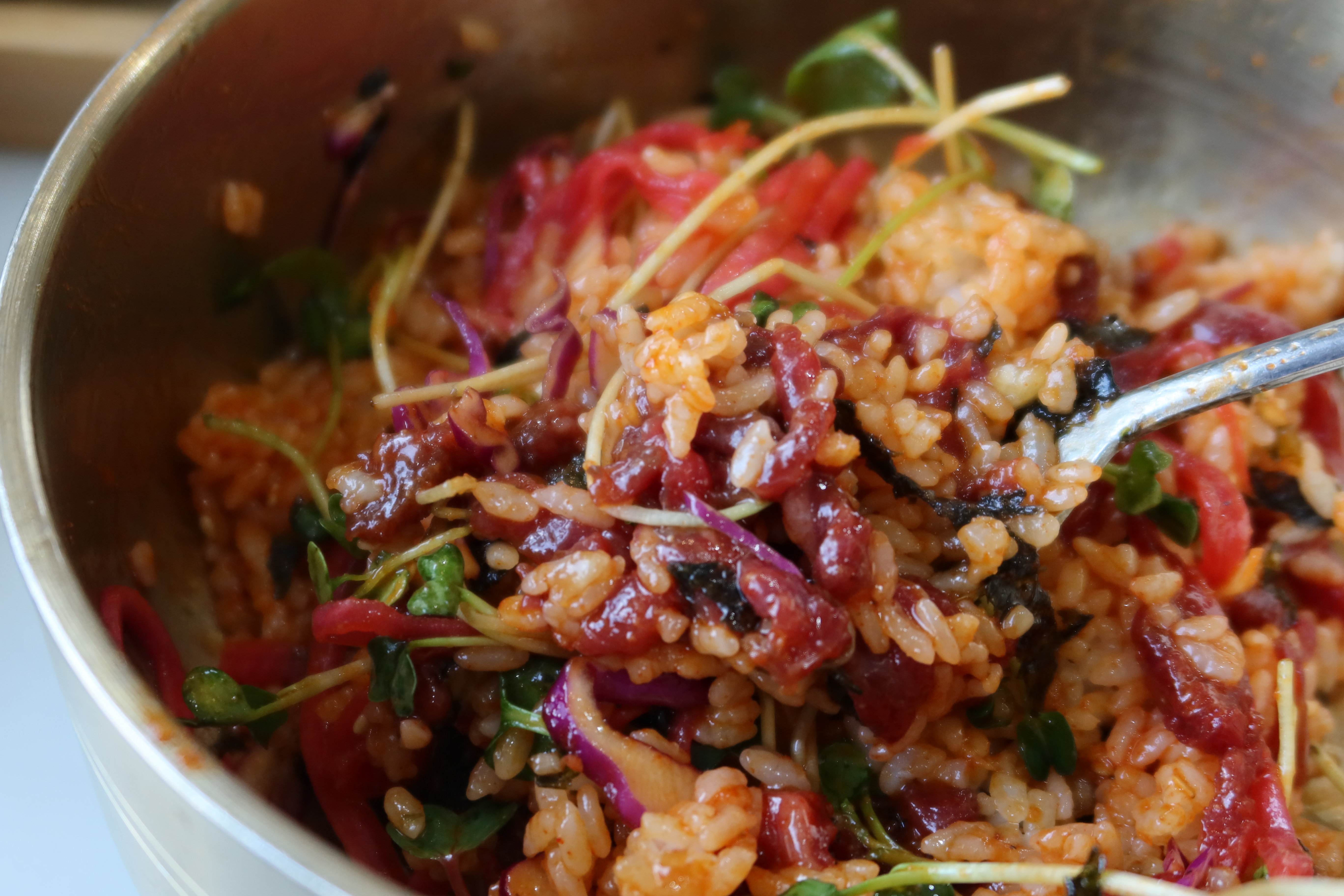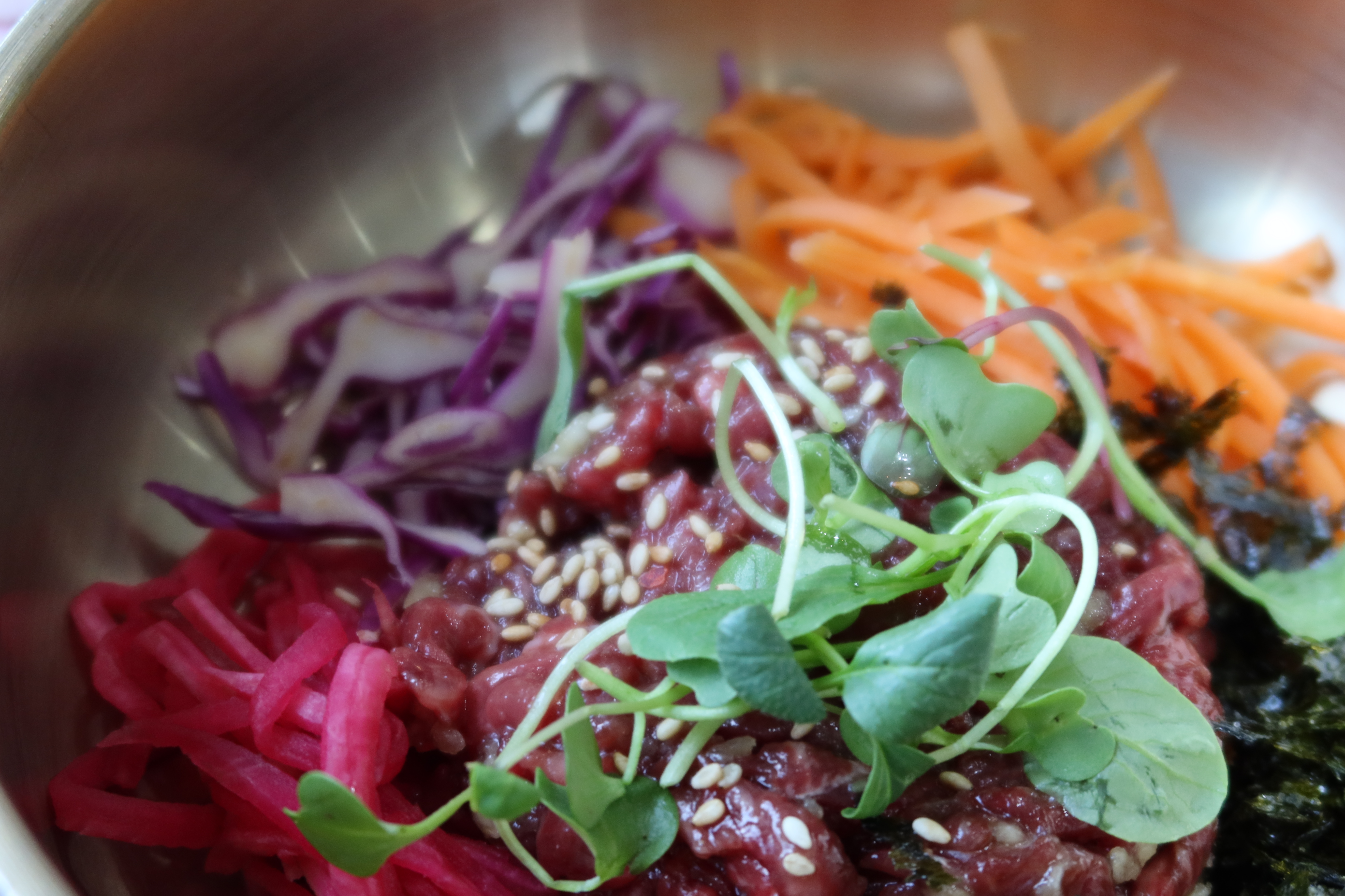 첫번째로는 한우육회비빔밥이 나왔습니다. 새싹과 절인무, 당근, 김가루, 양배추가 들어있어 고추장에 슥슥 비벼주니 맛있는 한우육회비빔밥이 됩니다. 맛있었어요. 사실 육회비빔밥 맛없기 힘들죠?ㅎㅎ