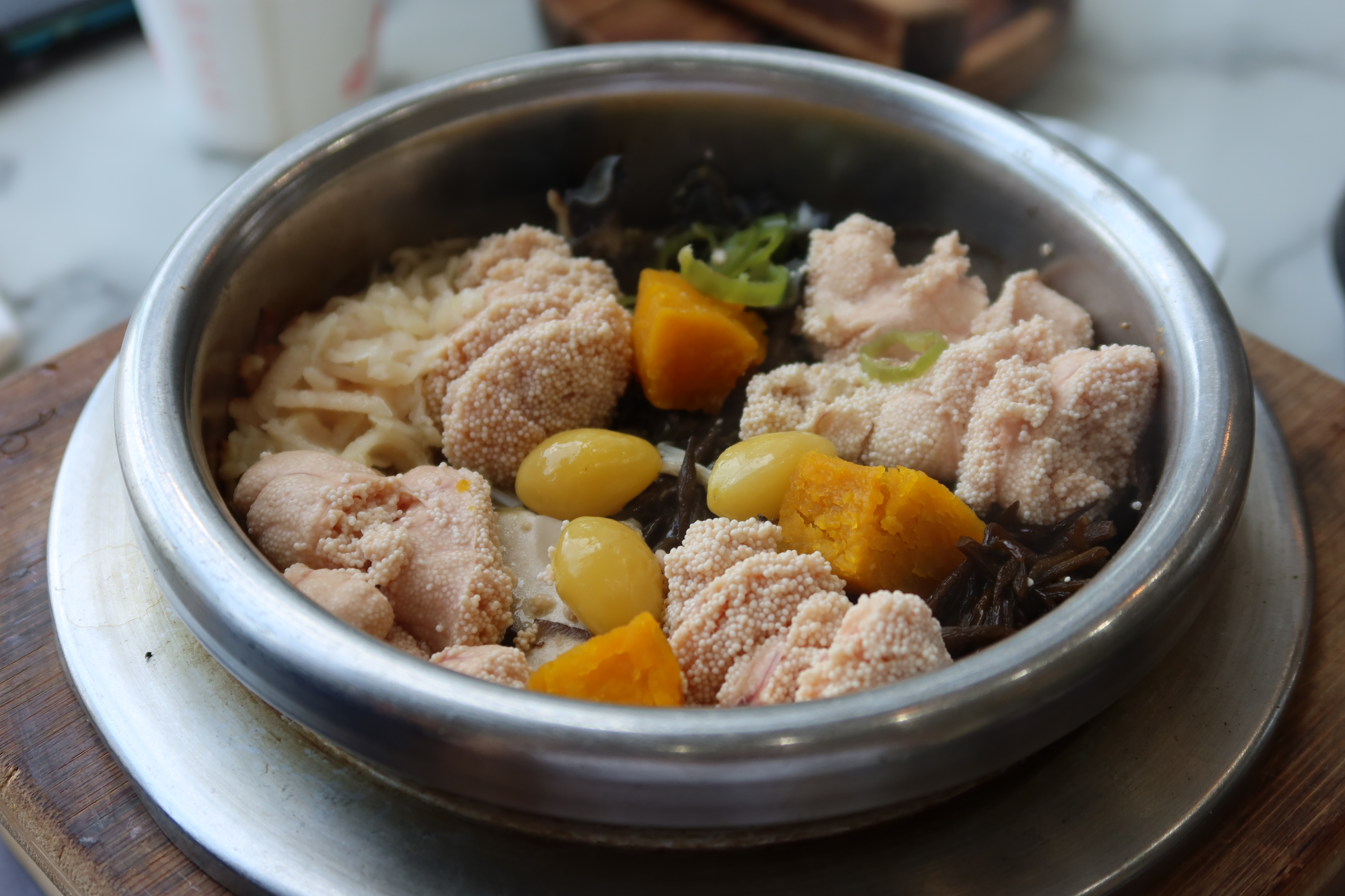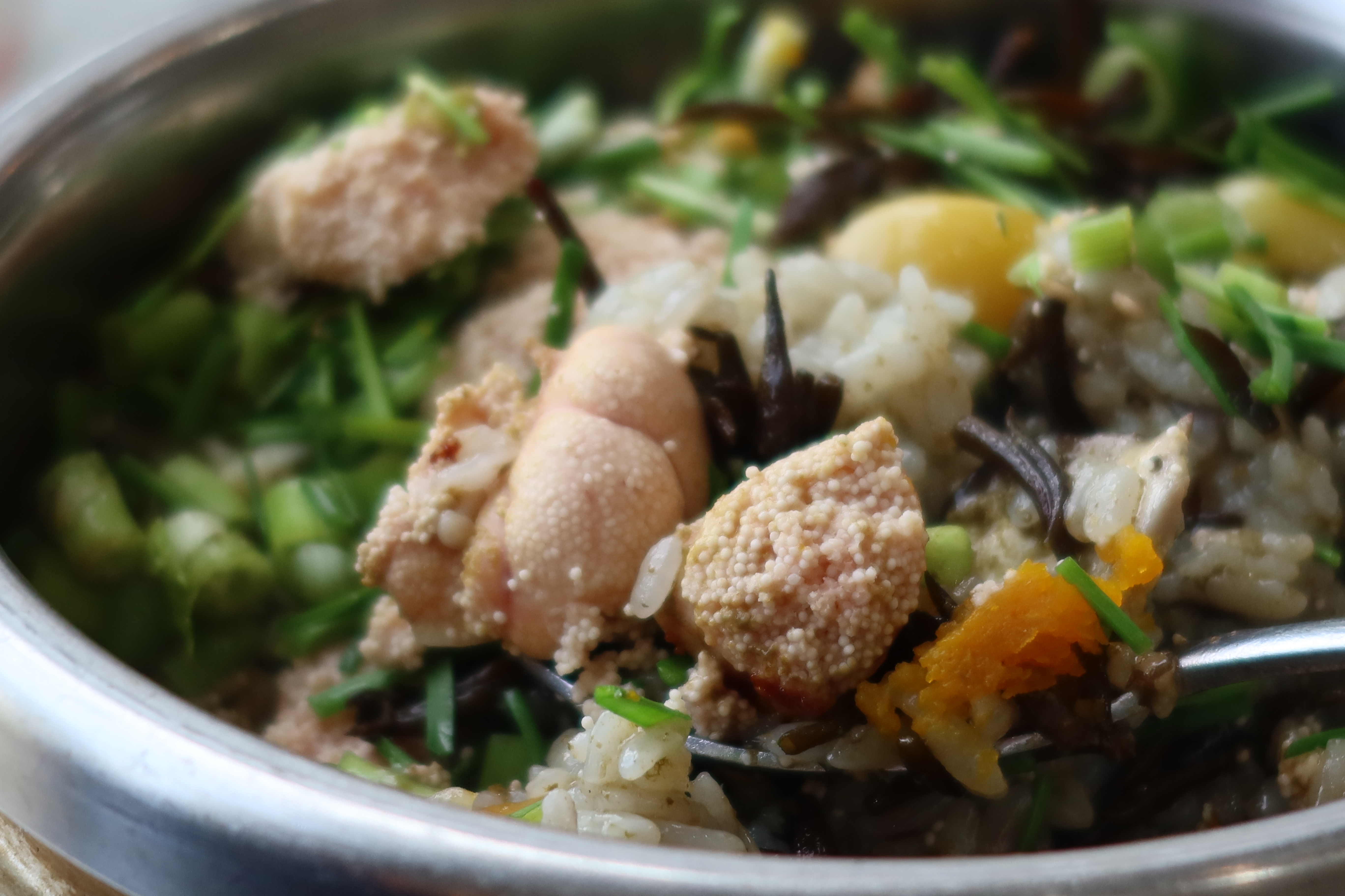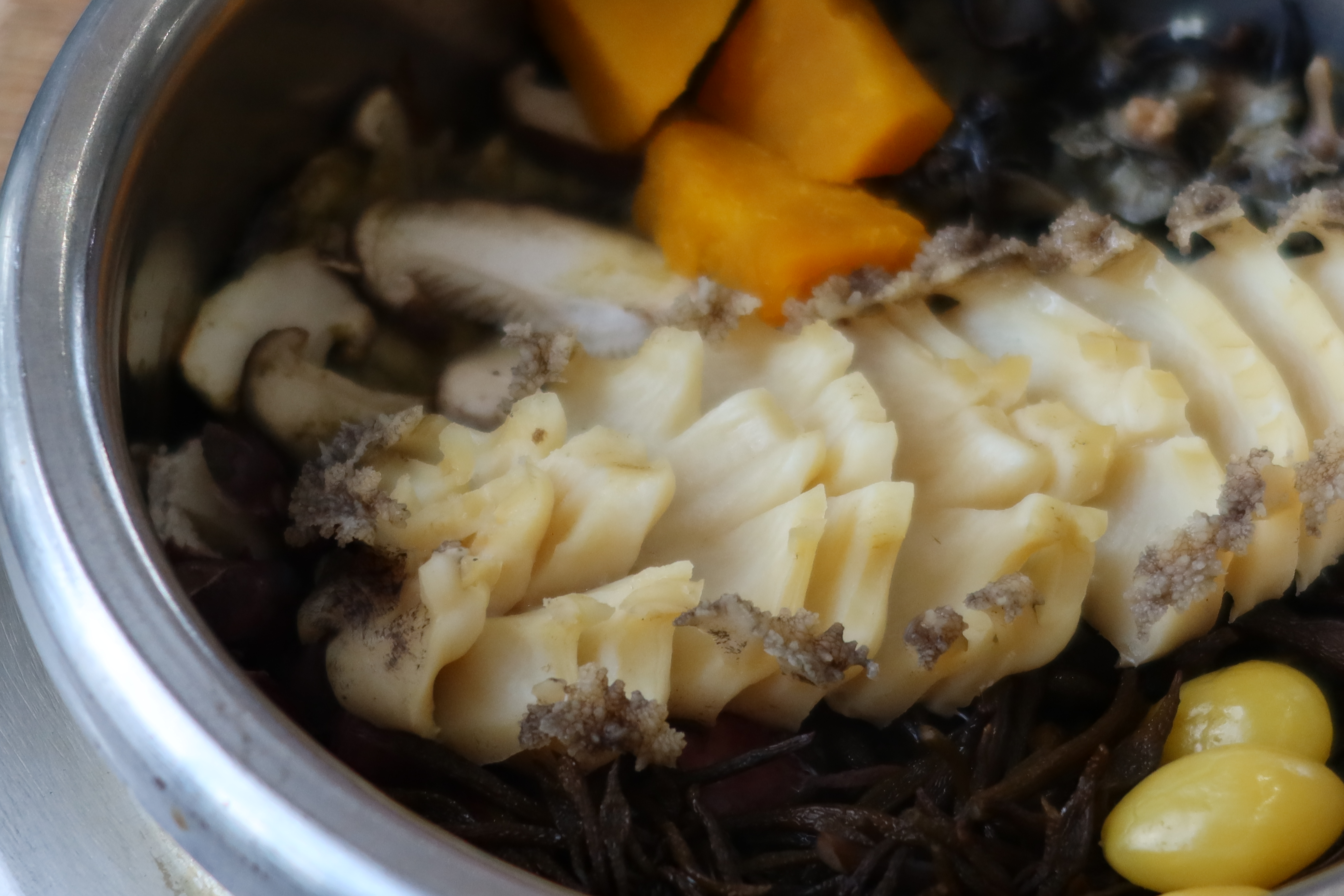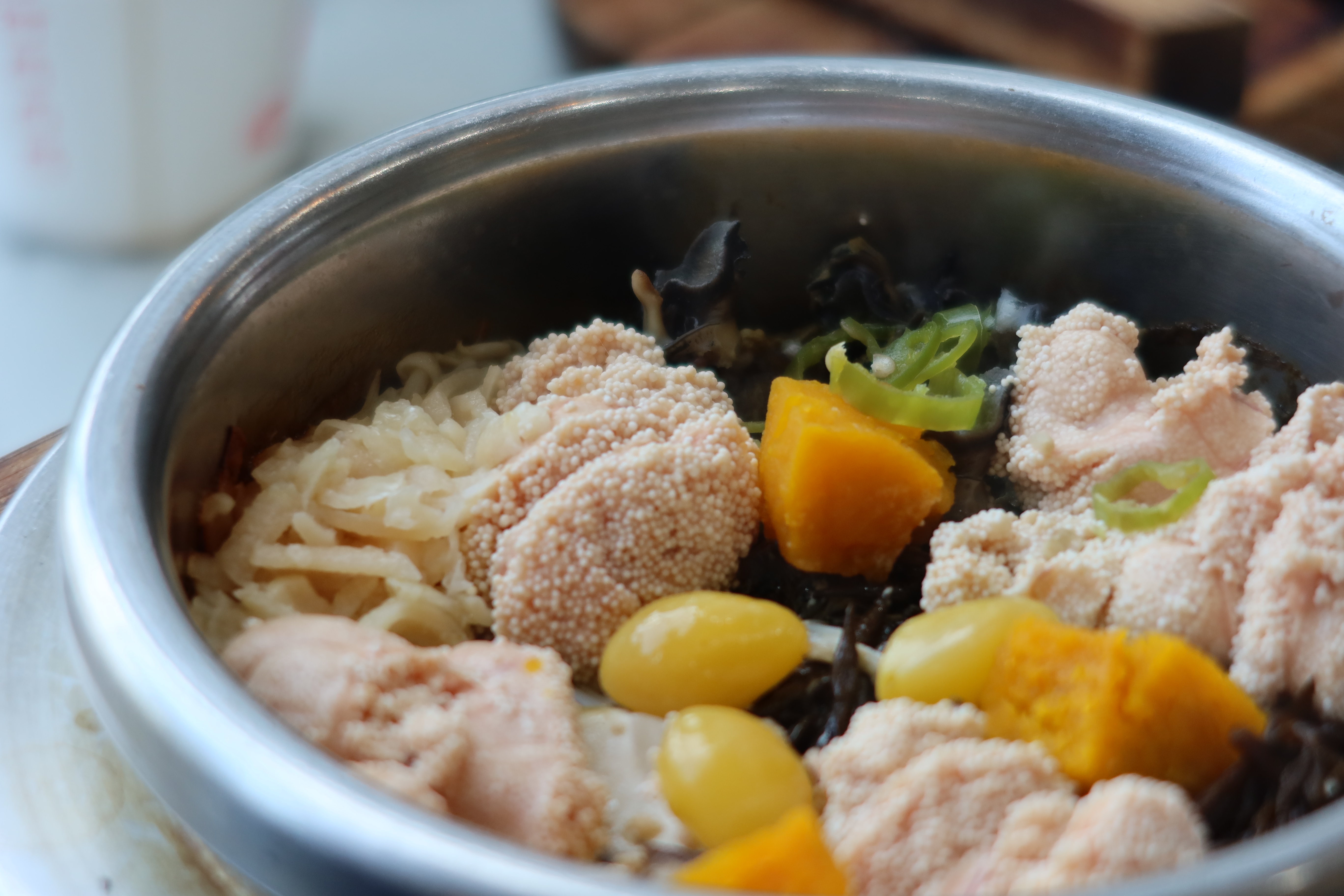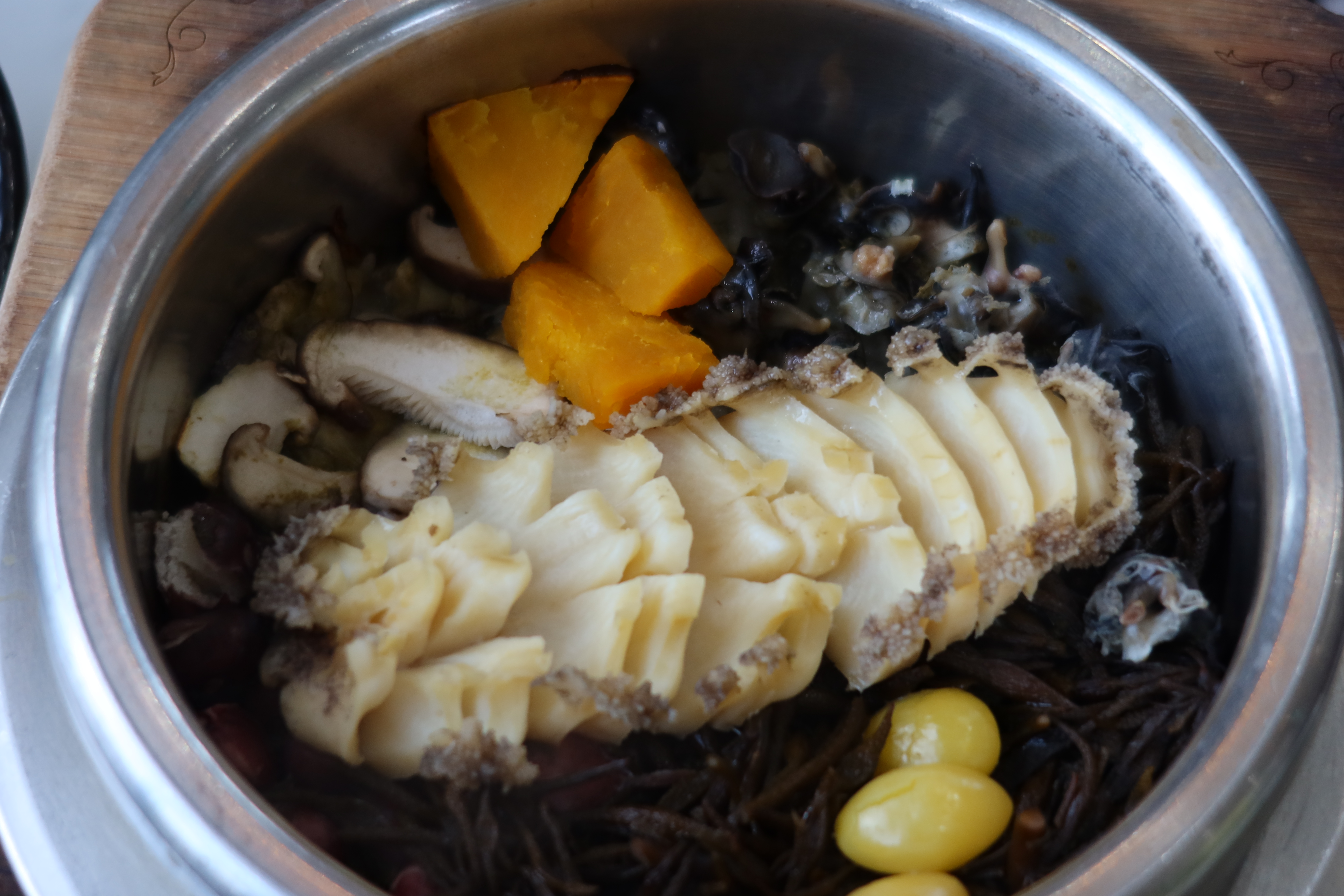 그리고 명란영양밥과 함께 전복영양밥도 나왔어요. 전복이 들어간것 이외에 단호박, 은행, 콩, 톳, 버섯, 파 등등 속재료는 동일해요. 명란젓 자체에 간이 좀 되어있어서, 전복영양밥이 명란영양밥보다 조금 더 싱거웠어요.