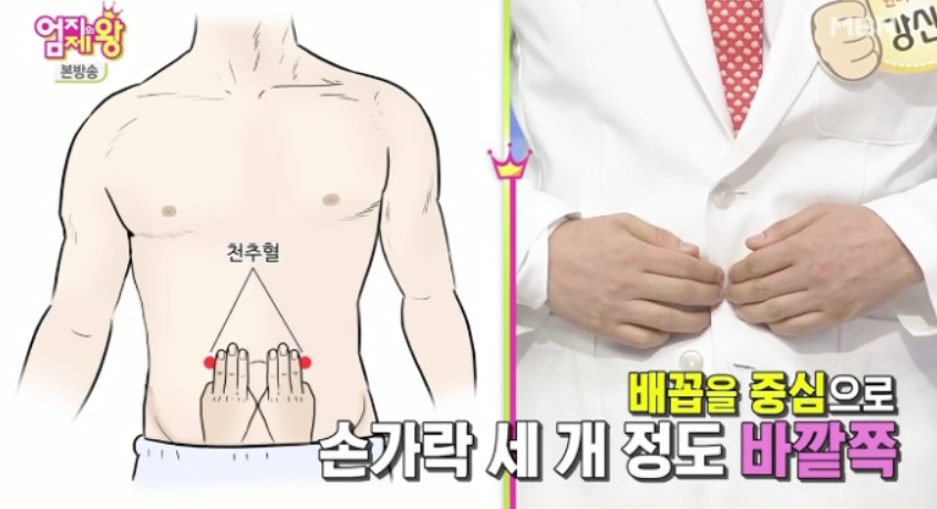 천추혈은 배꼽을 중심으로 손가락 세 개 정도의 바깥쪽에 위치해 있는데요, 이 천추혈을 지압하면 소화가 안될 때 효과가 아주 좋다고 합니다.