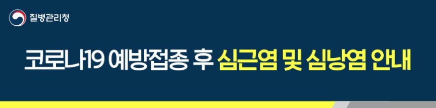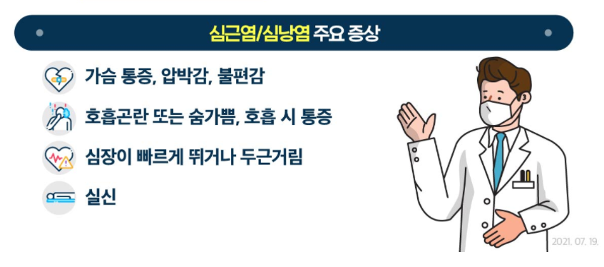 💡 심근염 / 심낭염의 주요증상은 가슴통증, 압박감, 불편감, 호흡곤란이나 숨가쁨, 호흡시 통증, 심장이 빠르게 뛰거나 두근거림, 실신 등입니다. 코로나19 백신 접종 후 이런 의심증상이 새롭게 발생하거나 악화되어 지속되는 경우 의료기관을 방문하여 진료를 받으시기 바랍니다.