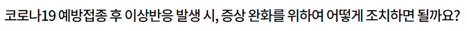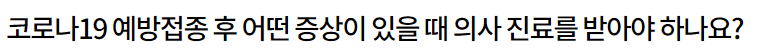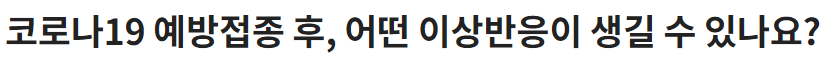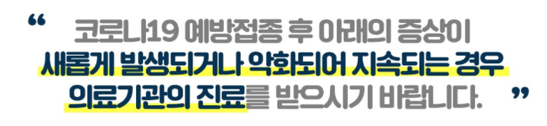 💡 다만 39℃ 이상의 고열, 알레르기 반응(두드러기나 발진, 얼굴이나 손 부기) 등의 증상이 나타나거나, 일반적으로 나타나는 이상반응의 증상이 일상생활을 방해하는 정도라면 의료기관을 방문하여 진료를 받으셔야 합니다.