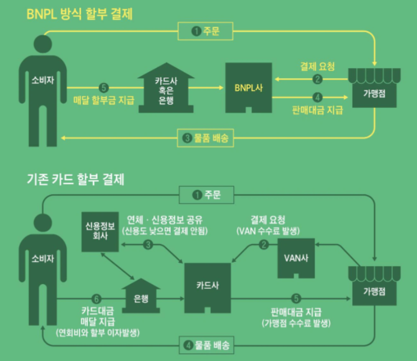 - BNPL 회사가 가맹점에 결제대금을 선지급하고 가맹점으로부터 수수료를 받는 시스템